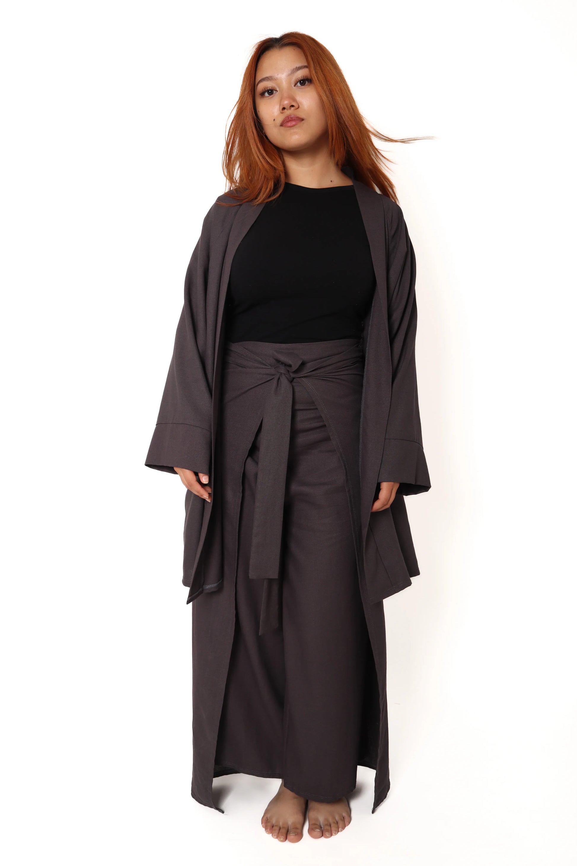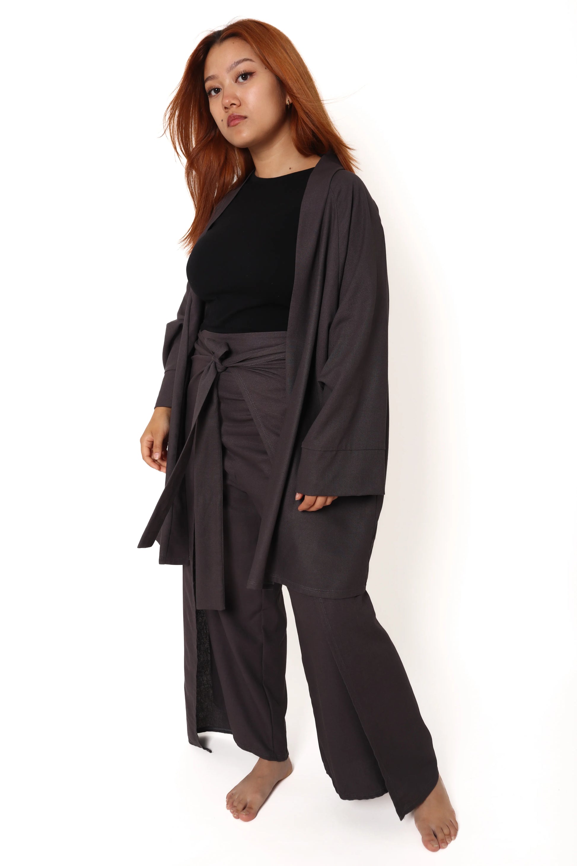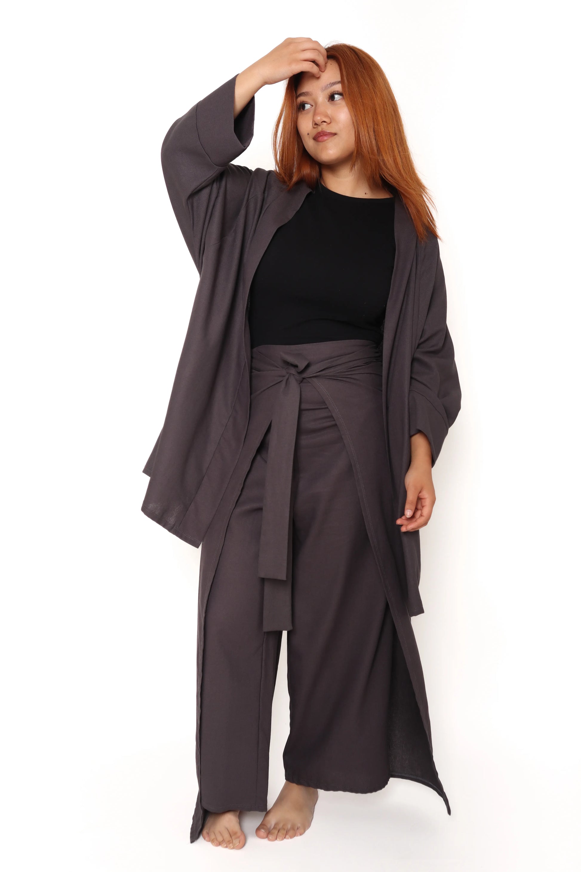 Un conjunto diseñado para sentirse fluido, elegante y naturalmente cómodo. El kimono Kyo aporta una caída ligera y envolvente, con movimiento suave y presencia sutil. Su silueta libera, acompaña y transforma cualquier postura con una estética limpia.