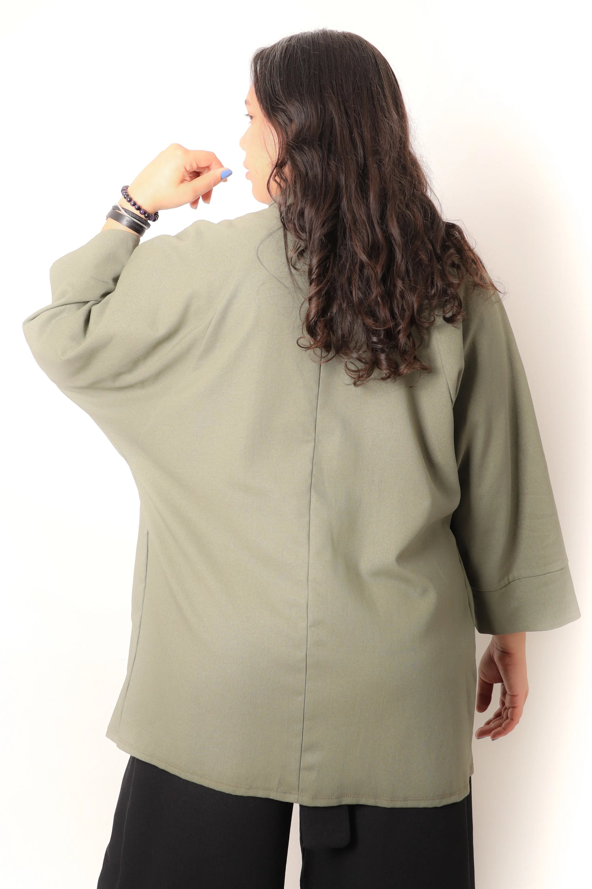 El Kimono Kyo está inspirado en el tradicional haori japonés, reinterpretado para darle a cada look amplitud, movimiento y elegancia sin esfuerzo. Su diseño de mangas ranglán elimina la rigidez de la sisa, lo que permite que la prenda fluya con naturalidad sobre diferentes tipos de cuerpo y refuerza la idea de un kimono realmente sin talla.